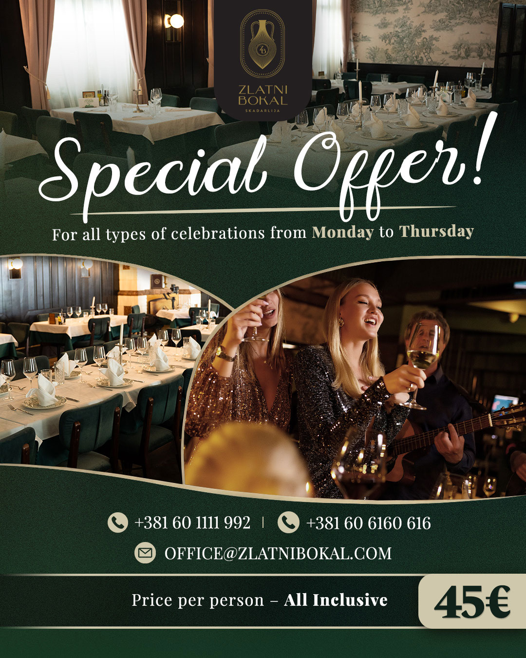 Take advantage of special conditions for organizing celebrations from Monday to Thursday and mark your important moments in the elegant and welcoming atmosphere of Zlatni Bokal.