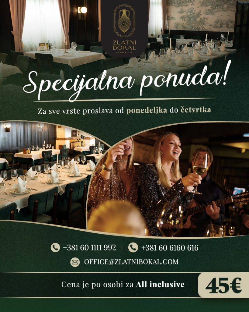 Iskoristite posebne uslove za organizaciju proslava od ponedeljka do četvrtka i obeležite važne trenutke u elegantnom i prijatnom ambijentu Zlatnog bokala.